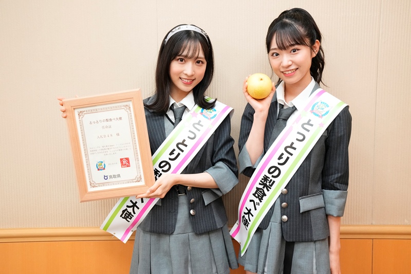 AKB48が「とっとりの梨⾷べ⼤使」に就任し、22⽇にメンバーを代表して⼩栗有以と⼭内瑞葵が都内で⾏われた任命式に出席。⿃取県 平井伸治知事より、任命証や⿃取県名産の梨などを贈られた。