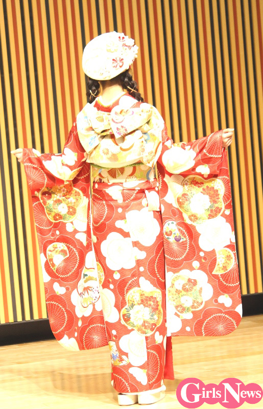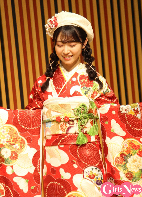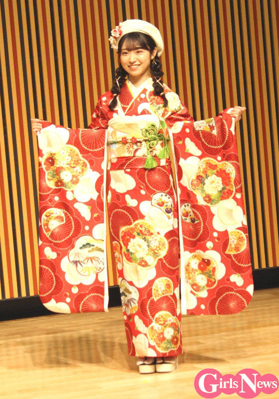 今回の山内さんの振袖は赤を基調にしつつ、「AKB48ならではの成人式にしたいなと思ったので、『失恋、ありがとう』で印象づいたベレー帽をポイントにしてみました」とベレー帽が大きなインパクトになった姿となった。