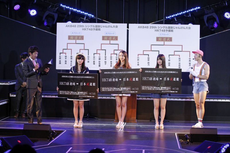 7月6日、福岡を拠点に活動するHKT48が「AKB48 29thシングル選抜じゃんけん大会」のHKT48予備戦をHKT48劇場で行い、森保まどか(チームH)・江藤彩也香(研究生)・中西智代梨(チームH)の3名が見事勝利し日本武道館への参加チケットを獲得した。