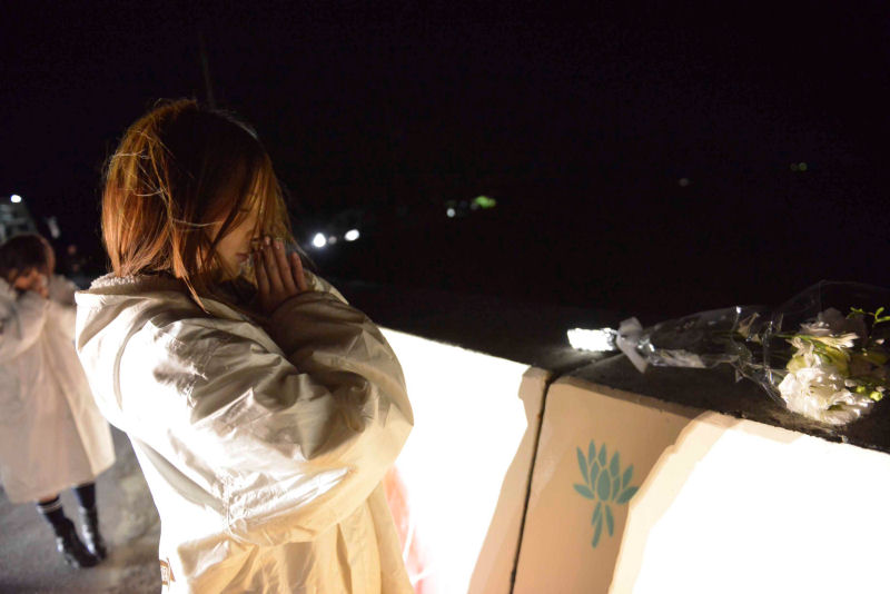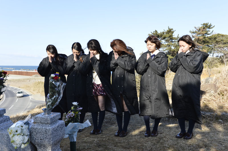 南相馬市では、今なおテトラポット設置作業が続く海沿いの慰霊碑を訪問し献花。震災が起こった14時46分には、メンバーがそれぞれの場所で黙とうを行い、犠牲にあわれた方々に哀悼の意を表しました。