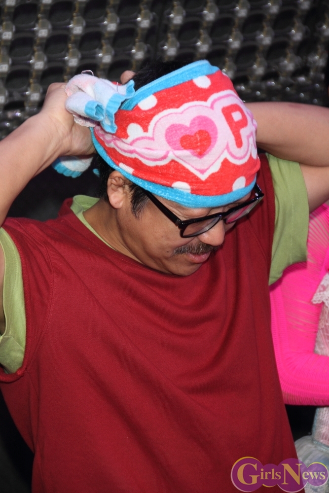 そして小柳朋恵さんは「母子家庭でお父さんがいなかったので、うちの母親がビッグダディの大ファンで、ひとつだけお願いがあって、ビッグダディのタオルとアリスプロジェクトのタオルを交換して欲しいんですよ。一生のお願いです。」とお願いすると、なんとビッグダディは非売品のピンクのタオルを急遽用意し、小柳朋恵さんが持ってるタオルと交換。小柳朋恵さんはもらったタオルを早速ダディ巻きで付けようとするも、上手く巻けず、ロケットニュースのビッグダディ似の記者に巻くのを手伝ってもらうと、小柳朋恵さんは「ダディに巻いてもらいたかった・・・。」とひと言つぶやき、記者の笑いを誘っていた。