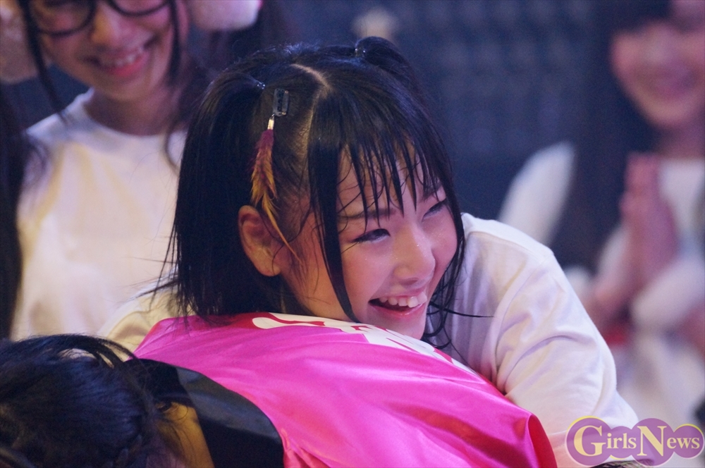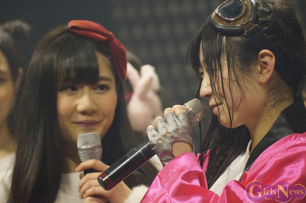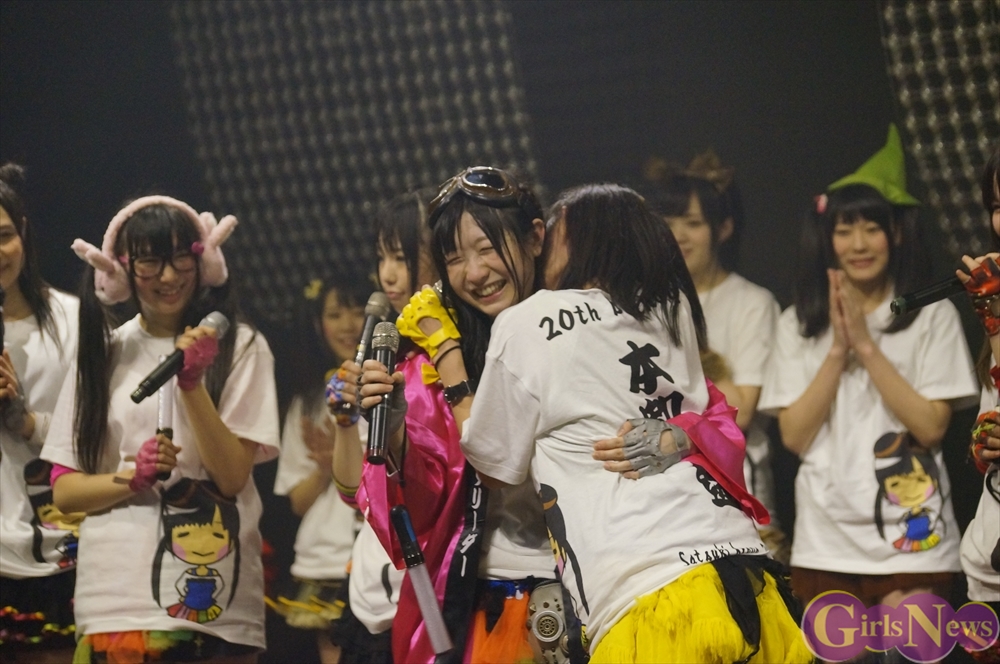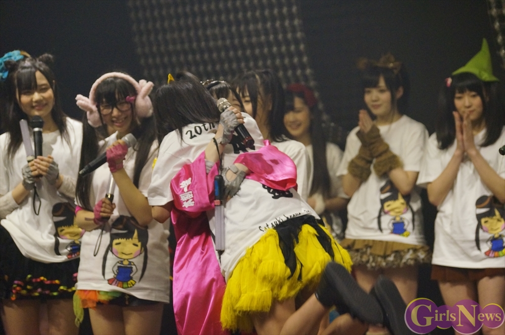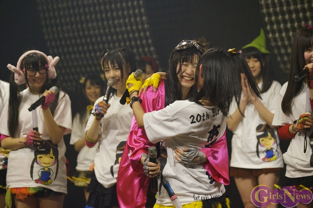 そして、アリス十番の早瀬愛夢さんは「皐月とは事務所に入って一番最初に話したタレントで、最初初めて会った時、吉祥寺SEATAで会ったんですけど、めっちゃ覚えてるよね? 一緒にガストとか行ったもんね。一年間ずっと青森で学校通ってたから、出てくるの1年遅かったけど、出てきたとたんに愛夢より人気出ちゃってね(笑)。愛夢もいつも癒されてて、みんなに愛されていて素敵な存在だと思うので、これからも頑張ってください。二十歳おめでとう!」と語ると、早瀬愛夢さんも新矢皐月さんに抱き着いてキス! 新矢皐月さんは「チューされた!」と照れ笑い。