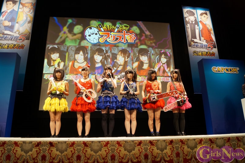 アリス十番のリーダー 桜のどかさんは「私たちアリス十番は毎日ライブしかしていないので、『逆転裁判5』という作品に携わることができて本当に光栄です。ミステリーということで私たちのホームである“P.A.R.M.S(パームス)”が殺人現場になってしまうわけですけど、まさかこの中に犯人がいるとは私は信じていないんですけど、是非是非みなさんヒントをたくさん探しつつ犯人を探し出してください。」とアピールした。