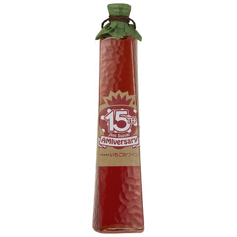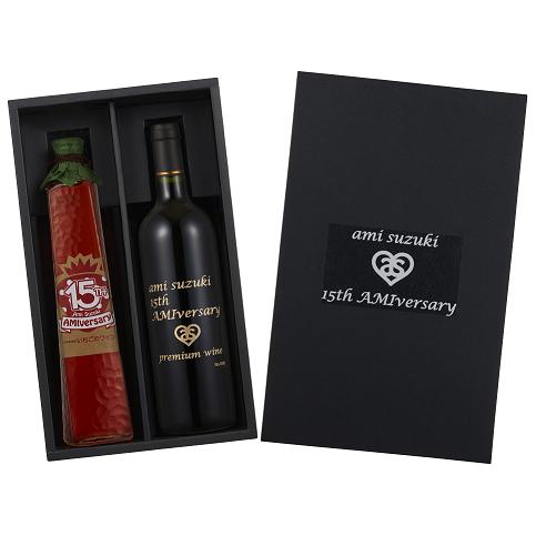 15周年ロゴにぴったりな爽やかな酸味とほのかな甘みのいちごワインと、少し重めだけれど飲みやすいフランス産赤ワインのセットで、赤ワインのボトルは記念デザインが彫刻され、シリアルNo.が刻印される。