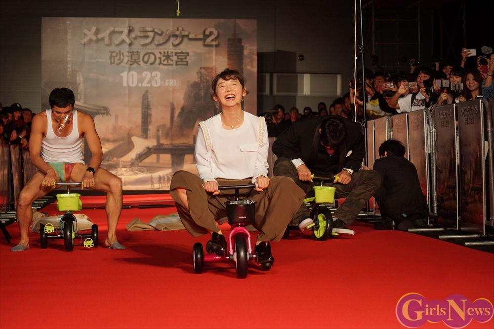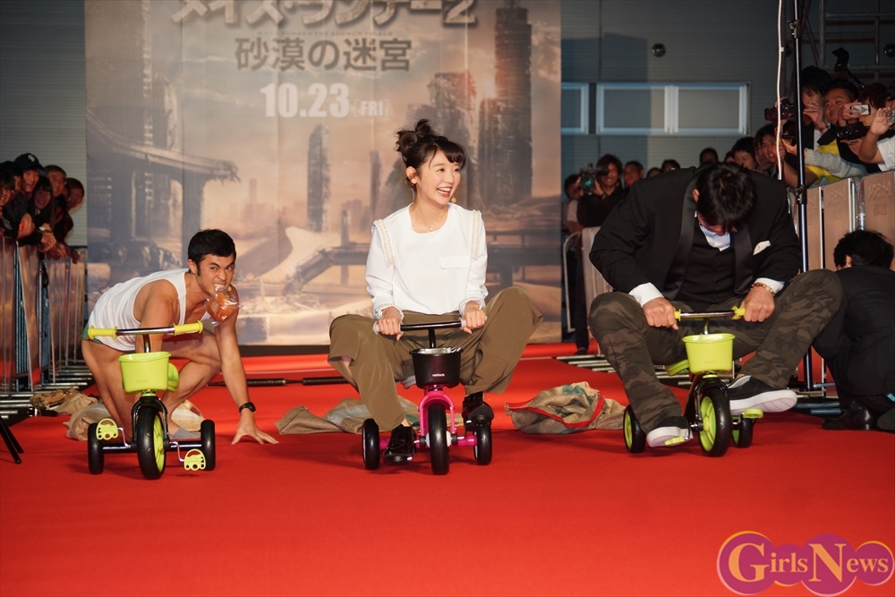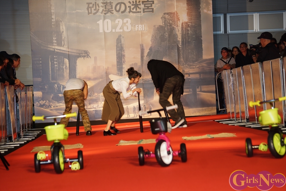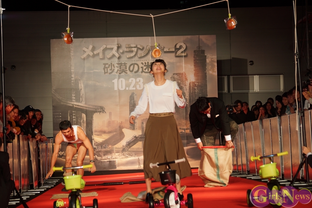 今回、『メイズ・ランナー2:砂漠の迷宮』はサバイバルがテーマということで、レッドカーペットには様々な障害が用意され、ぐるぐるバット、麻袋競争、パン食い競争、三輪車競争の障害物競争に挑み、勝者のみギャラが支払われるという・・・。