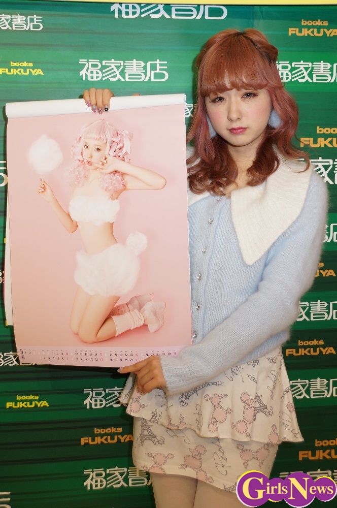 カレンダーについて「今回のカレンダーのテーマが“EVERYDAY SWEETS”みたいな感じで、私自身が色んなお菓子になりきってます。例えばマシュマロになりきってみたり、デコレーションケーキになりきってみたり、ソーダフロートに浮かんでみたり、一番お気に入りのページはコットンキャンディーになりきってたりするんですけど、お菓子と女の子の融合というものを自分なりに考えてみました。ヘアーメイクのアイディアとかお洋服のスタイリングも全部自分でディレクションしているので、自分の中のハート面を押し出した作品になってます。」とアピール。