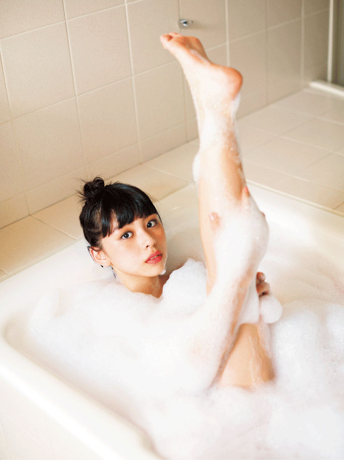 お気に入りのカットについて、お風呂で脚を上げているカットを紹介し「私が以前、“ファースト・クラス”のドラマで共演した菜々緒さんのポーズを参考に撮らせていただきました。本当に普段スパガでは見せない自然体の表情が撮れました。」と大満足な様子。