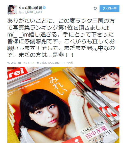 9月7日、人気アイドルグループ SUPER☆GiRLSの田中美麗さんが今年7月に発売した自身初のソロ写真集「みれい」(宝島社)が、TBSで放送されたランク王国の「アイドル写真集 売上げTOP10」で見事1位を獲得し、ブログやTwitterで喜びを報告している。