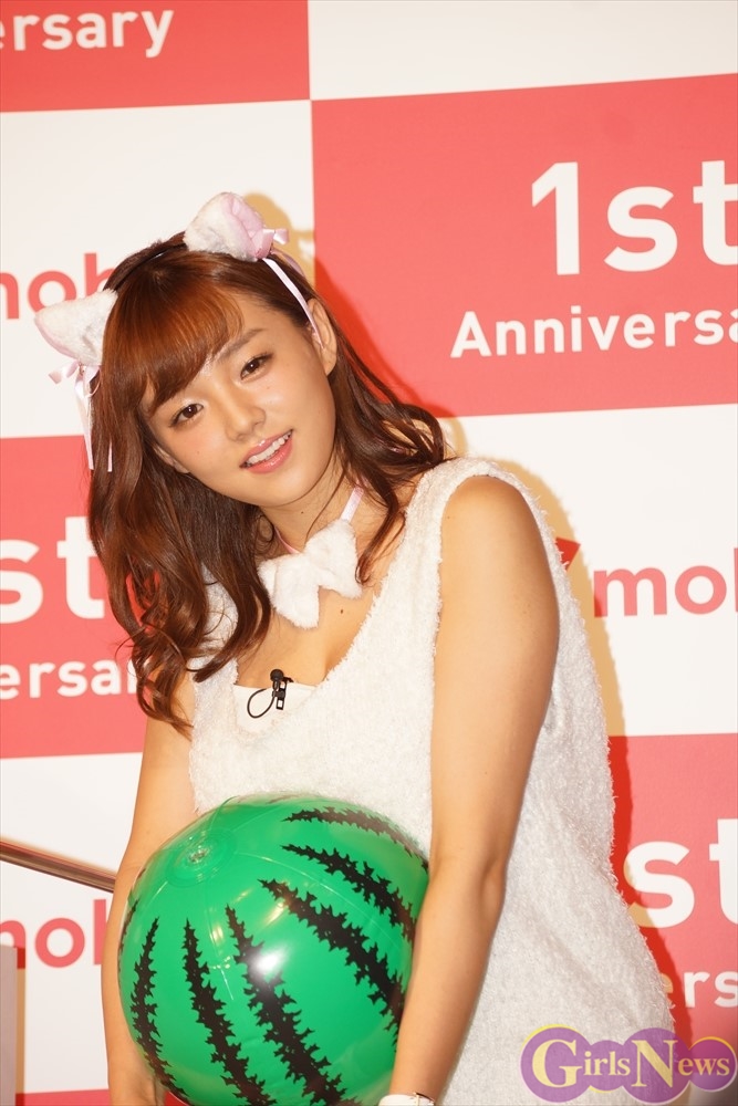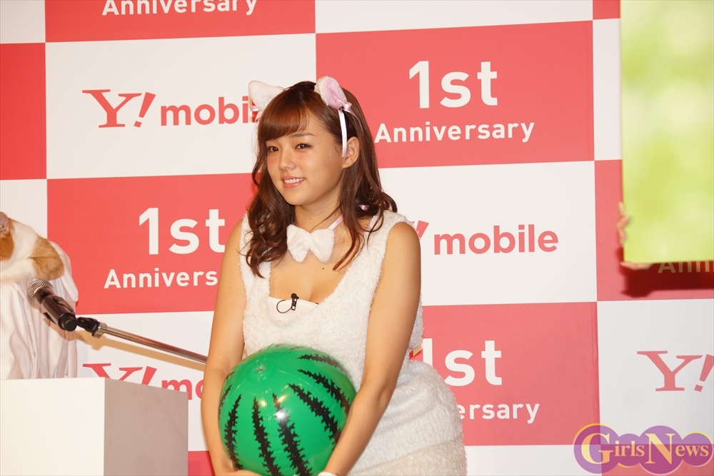 さらに、ふてニャン写真集の中にあるスイカを持ったカットと同じポーズを篠崎愛さんと渡辺直美さんにもチャレンジしてもらい、さらにワイモバイル1周年をケーキで祝福するなど、お祝いムード1色のイベントとなった。