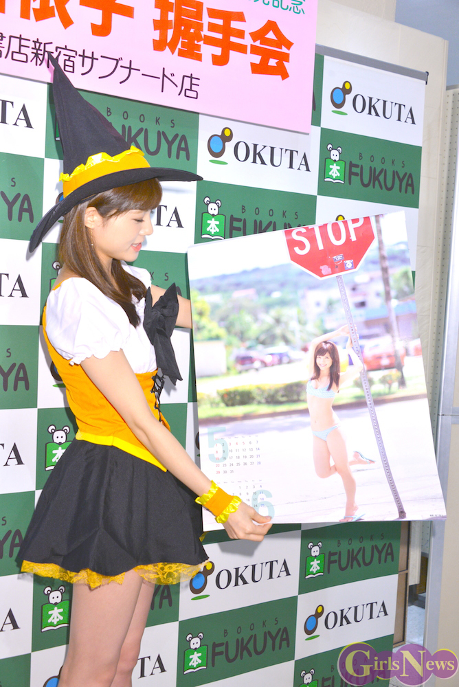 イベント当日はハロウィンということで、この日の松川佑依子さんの衣装は魔女っ子のコスチューム。松川佑依子さんに衣装のポイントを聞くと、「ファンの方に喜んでもらいたくて、コスプレにしました。他人が選んだコスチュームの方が自分に似合うと思ったので、マネージャーにお願いしたら、あまりにもスカートが短くて……。急きょ、スカートの下にはくズボンを買ってきてもらいました。最初はパンツが見えていたんです。普段はミニスカートは履かないので、ドキドキします。女の子のファンの前でも、これは緊張しますよ。歩くたびにお尻が気になります。」と恥ずかしそうに語った。