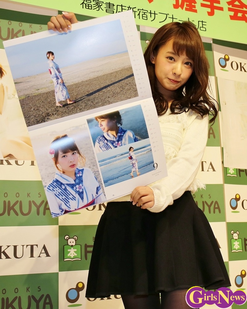 カレンダーの見どころについて「NMB48を卒業して3ヶ月が経ち、いつもよりもう一段階プニッとしています。そして、髪の毛の短い写真はこのカレンダーだけです。」とアピールしていた。