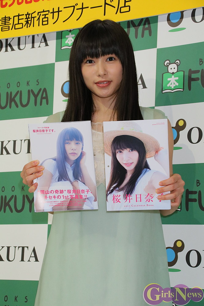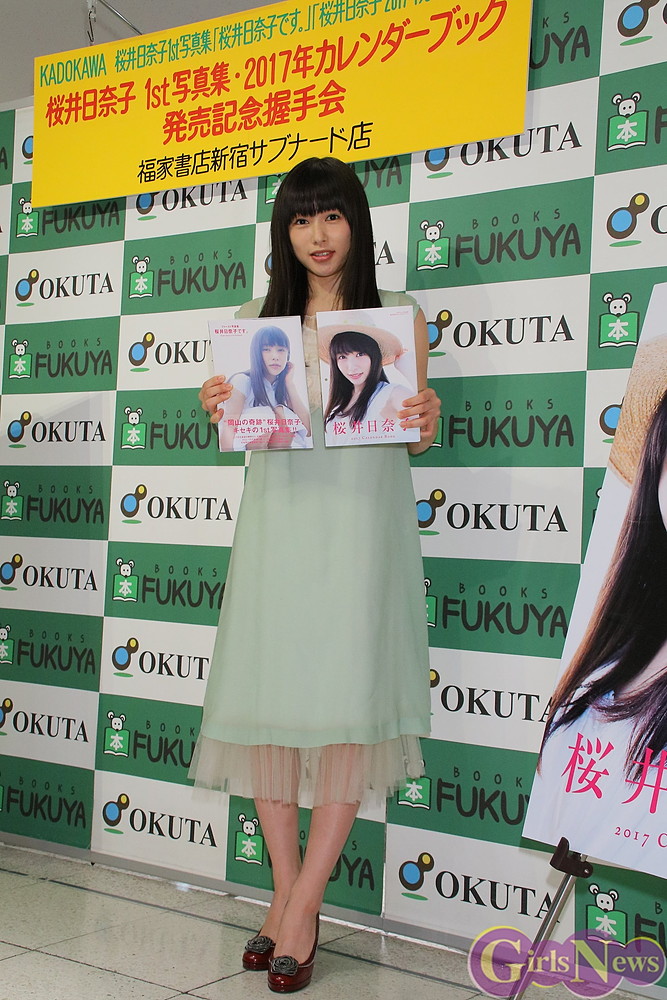 女優の桜井日奈子さんが13日、『ファースト写真集 桜井日奈子です。』と初カレンダー『桜井日奈子 2017 カレンダーブック』の発売記念イベントを福家書店・新宿サブナード店で開催した。