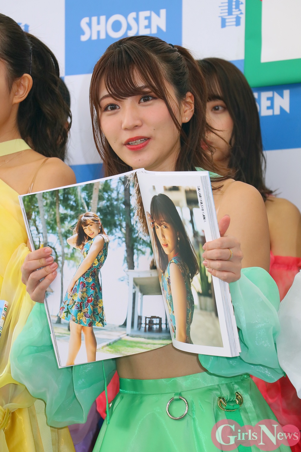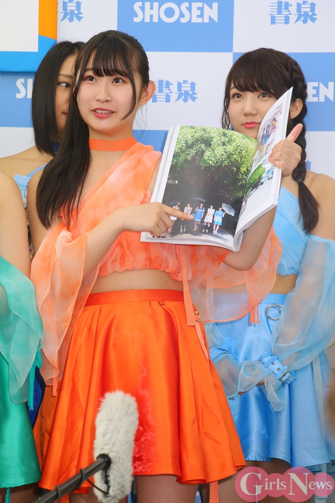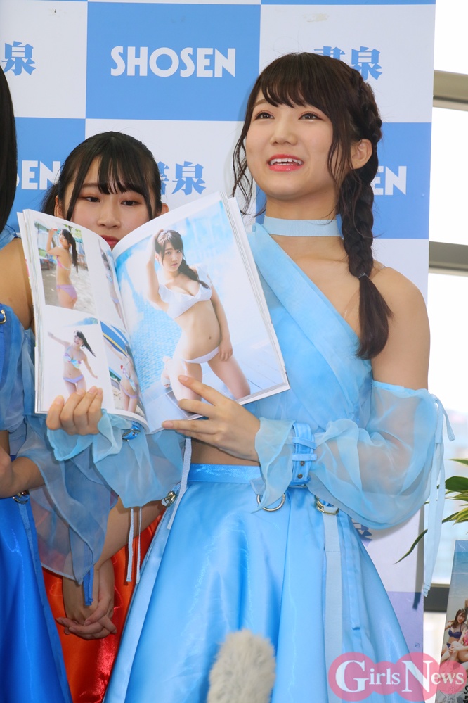 写真集の見どころについて聞かれたメンバーたちは、「見開きで載っている写真ですが、寝転がって撮影するのはセクシーだなぁ、と自分でも恥ずかしがりながら撮影しました」(長尾しおり)、「みんな水着と私服なのに私だけ私服も水着みたい。スケスケで恥ずかしい」(石橋蛍)などと話した。