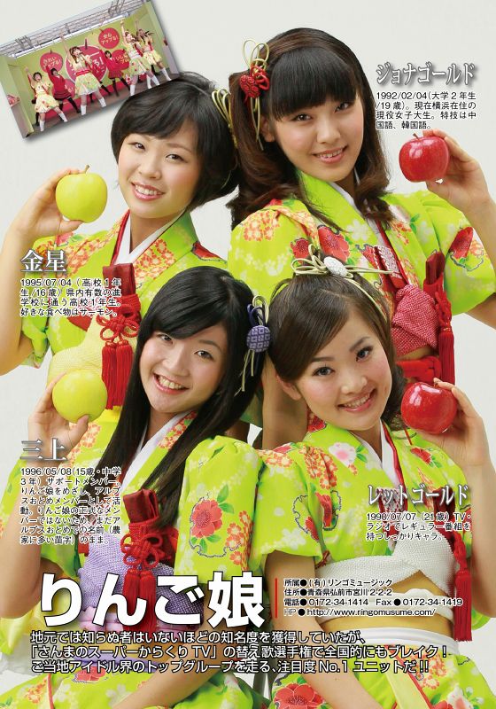 注目のご当地アイドルのひとつが青森県で主に活動するりんご娘。 音楽活動から、地域イベントへの参加、最近では TBS「さんまの スーパーからくりTV」で第8回芸能人かえうた王決定戦で新人賞 を受賞するなど他を圧倒する知名度を獲得!果たして彼女たちは 栄冠を手にすることができるのでしょうか?もちろん、他の有力候補 たちからも目が離せません。