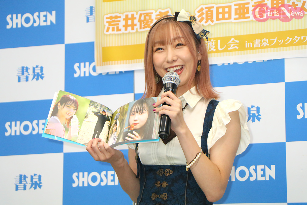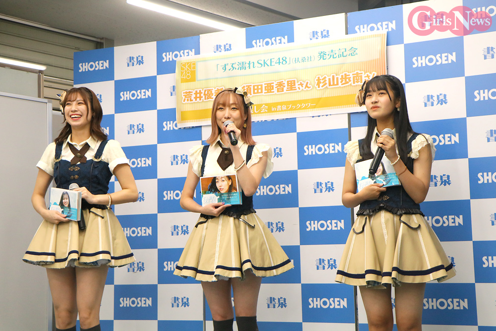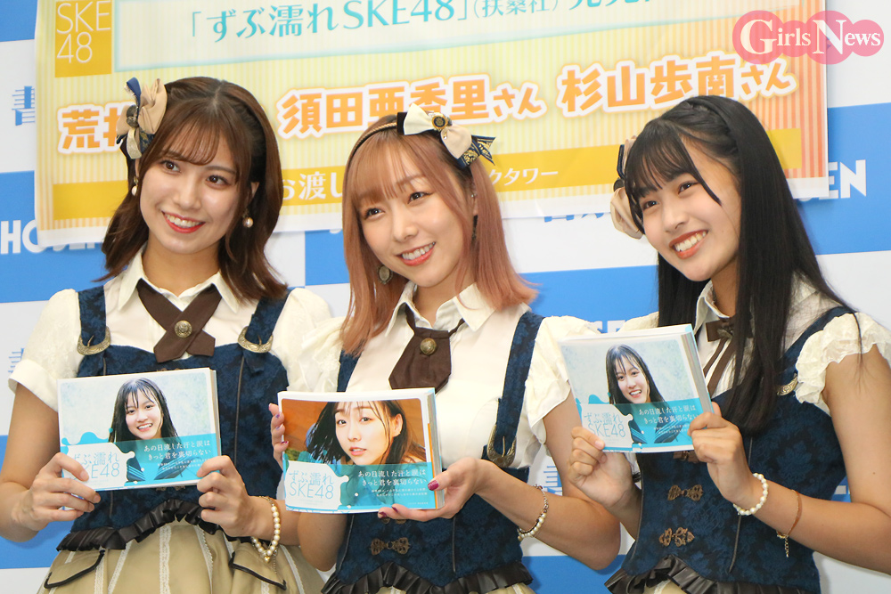 写真集『ずぶ濡れSKE48』の発売記念イベントが、秋葉原・書泉ブックタワーにて7日に開催され、メンバーの須田亜香里、荒井優希、杉山歩南の3人が囲み取材に出席した。