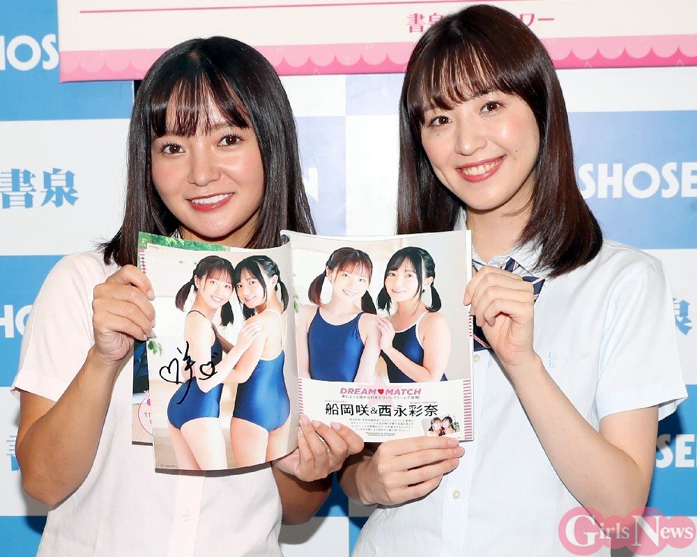 船岡さんは「スク水はジュニアアイドル振りに着ました。たぶん最後になると思います。もしまた着ることがあったとしたら、西永さん案件になると思います。最初はスク水を着ることを知らなかったのでオファーをいただいたときは嬉しかったです。彩奈ちゃんと二人で撮りおろしは初めてだったのでめちゃくちゃ嬉しかった。彩奈ちゃんとふだんから仲がいいけど、撮影ではふだんない距離感、チューする寸前なのでドキドキでした」と語った。