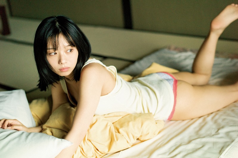 また到着したアザ―カットは、ほぼすっぴんで布団に横たわりながら、窓越しの日差しを見つめる峰島さんの、無防備なタンクトップと美しいヒップラインも写し出されている。