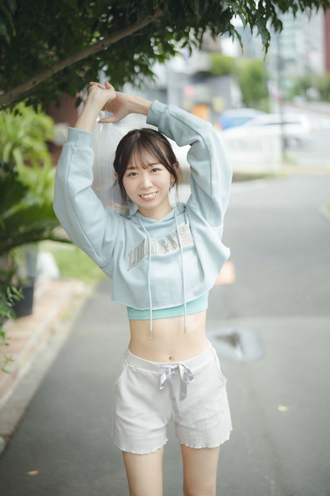 写真集のテーマが「同棲感」とあることについて、同棲の経験は?と聞かれると、「ないです!」と即答。「可愛い女の子の写真をSNSで見るのが大好きでよく見てるんですけど、私もハウススタジオで撮りたいってリクエストしたら、プライベート感が出ている写真が多くなりました。アザーカットの1枚がコンビニの袋を持って道を歩くシーンで、それが同棲感があるなって言ったら、 全体のテーマっぽくなっちゃいました」と理由を明かした。