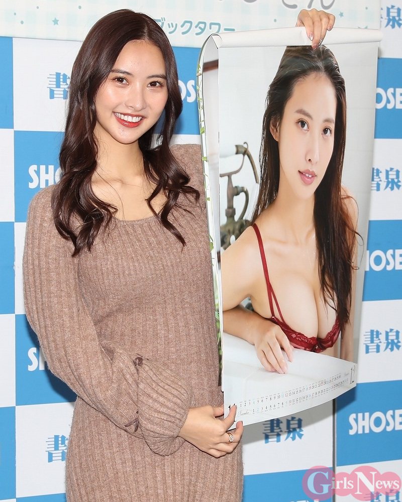 2年連続発売となるカレンダーは9月に鎌倉で撮影、「前回は海だけでしたが、今回は海にも山にも行きました。テーマは“ありのままの自然な私” です。水着は全部自分で選びました。その中でのお気に入りは真っ赤なビキニで生地が少なく胸がドーン!と出ていちばん胸が強調されています。1月2月のカットは表情が好きで大人セクシー。私は人妻などしっとりしたイメージがあるので“THE定番”というカットです」と紹介。