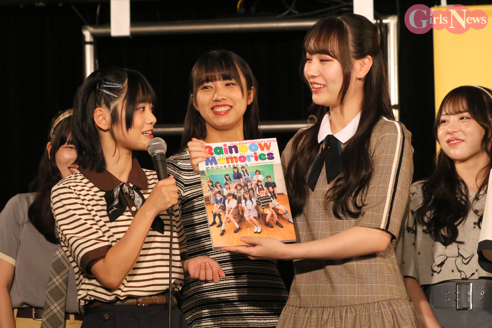 誌面では、プールではしゃぐメンバーたちの貴重な水着写真のほか、アイドルの象徴とも言えるステージ衣装を紹介するページには、ファンでも実際に生で見たことが少ないであろうレア衣装から最新衣装まで登場。虹コンの10年間という歴史の中から厳選された34着をメンバーのコメントとともに紹介している。