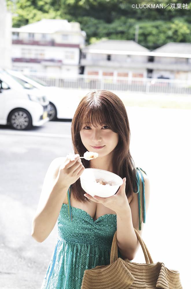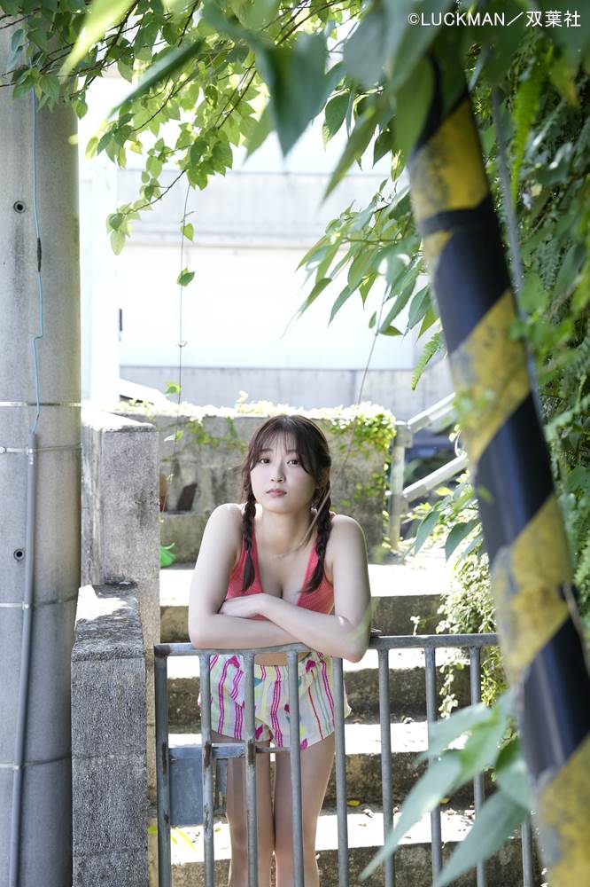 お気に入りのカットについては「全部好き過ぎるんですが、特に夕日を浴びたプールでのカットが気に入っています」と紹介。実は浮いているのではなく、脚を持ってもらって撮影していたことを明かし、「私はすました顔をしているけど、裏ではスタッフさんが濡れながら大変でした」と裏話も明かした。