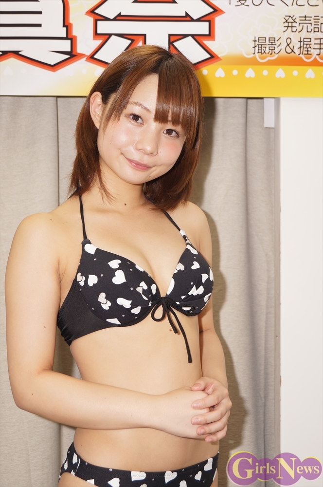 DVDの内容について質問され「今までで一番露出を頑張ってます。変形水着が初です。頑張って(谷間を)出してます。」と紹介。