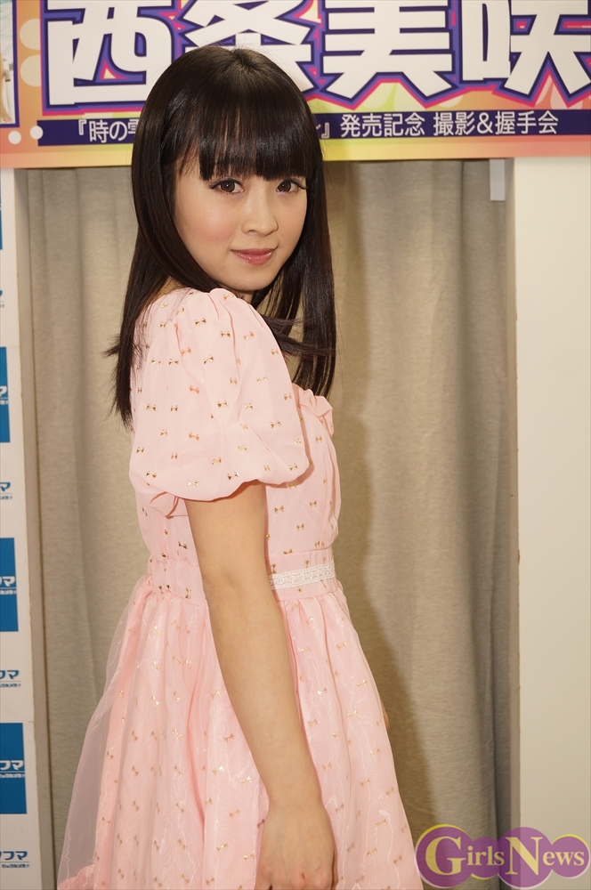 DVDの内容について質問すると西条美咲さんは「表紙になってるピンクの水着のシーンは“ザ・グラビア”という感じで気に入ってます。自分らしさをどうしても入れたくて、自分で衣装を選んだシーンがあって、コルセットを着て、自分のテーマであるドーリーなイメージを表現してもらいました。もう1個おススメなのが眼帯水着なんですけど、眼帯みたいに胸に着けてやる水着がすぐずれて来るんですけど、色がすごい可愛くてお気に入りです。」と紹介。
