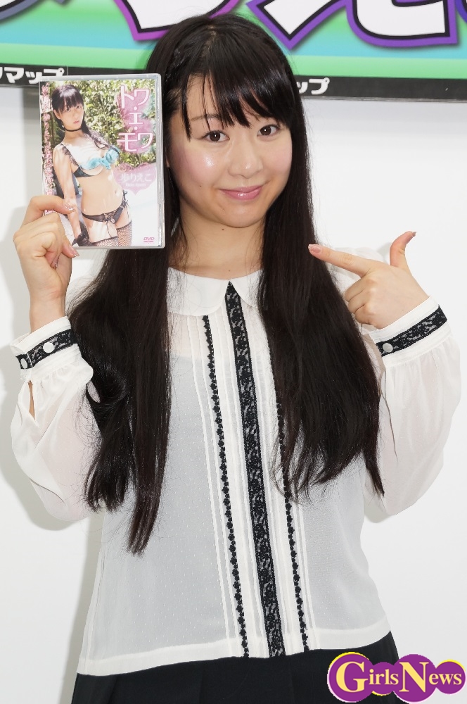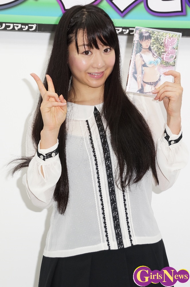 DVDの内容について質問されると「今回は妄想がテーマで、私が教師になり妄想で生徒を誘惑してます。待っているタイプなので誘惑するのは得意ではないです。ツルッツルな競泳水着はピタッと吸い付くようなフォルムなので、質感や光によって見えたり見えなかったりするので見えてる気がするかも?じっくり見てください。」と紹介。