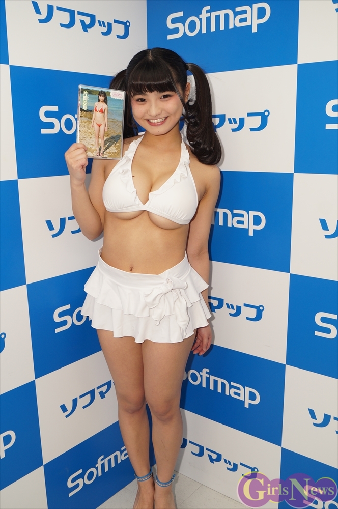 DVDの内容について「シチュエーションが多くて、テニスの先生とテニスの練習をしてたり、(メイドさん風の衣装で)朝彼氏を起こしてる設定のシーンがあります。私球技が苦手で、(テニスは)何回もやり直しました。黄色の水着が一番サイズが小さくて、尚、バランスボールの上で動いてるのでかなりボリュームがあると思います。」とアピール。