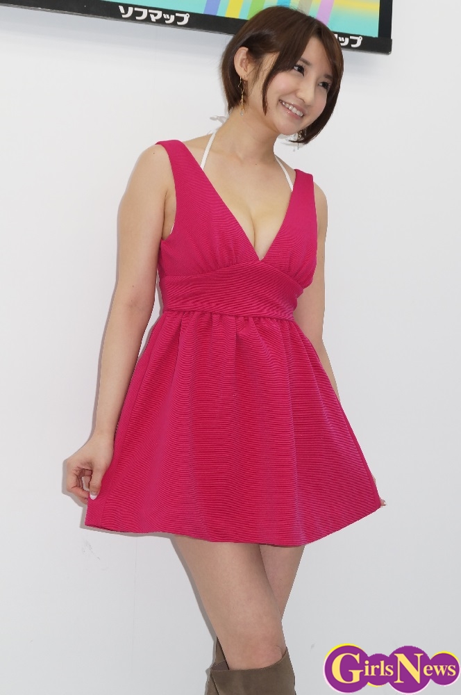 DVDの内容について質問されると「今回は接写、胸のアップが多いです。ジャケットのような肉感的な感じで、肌の弾力など伝わると思います。ナースのコスプレや競泳水着など、いろんな胸の見せ方をしているところがおもしろくて、彼にシャワーをかけてあげようとしたら私がビショ濡れにされてしまったり、ずっとくすぐられたり攻められるシーンが多いです。バーのシーンで酔って彼に甘えるところではセリフは全部アドリブです。」と紹介。