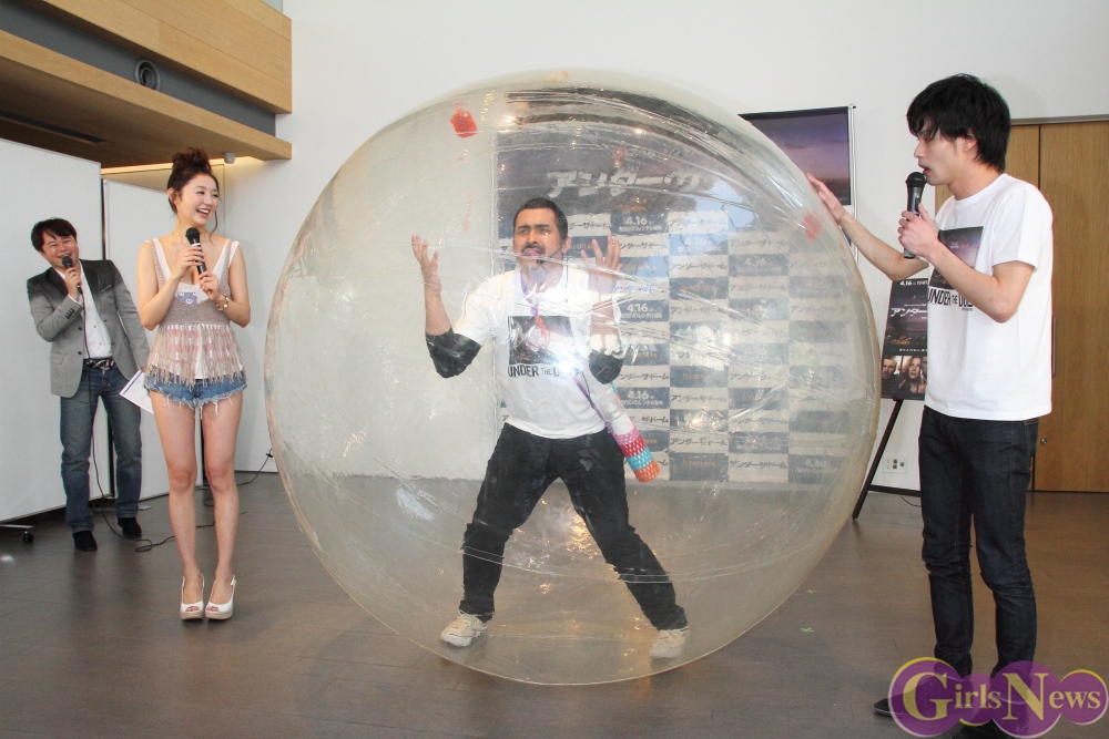 そしてハーフ芸人として知られる植野行雄さんは、作品のテーマ『誰も入れない。誰も出られない。』にちなみ、透明の小ドームの中に入り登場!