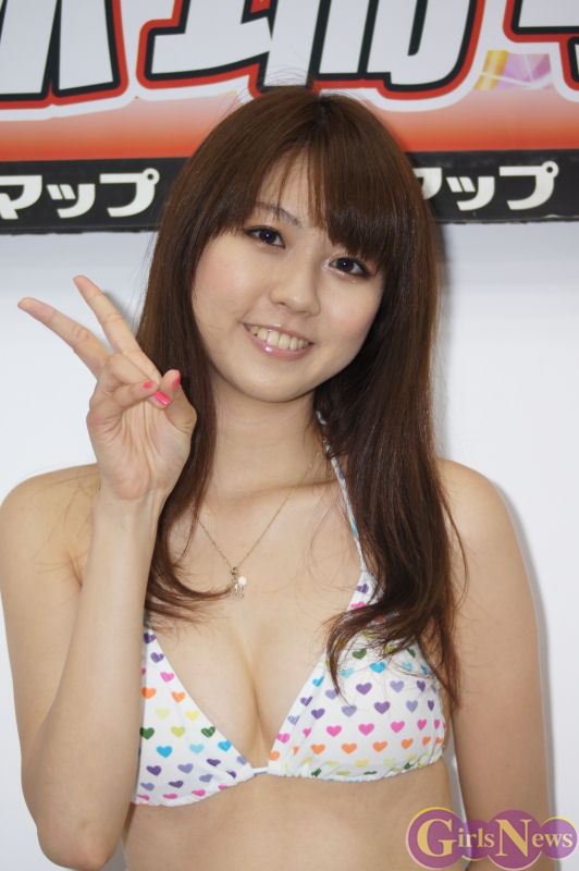 お勧めのシーンとして「体当たりレポートで恥らいながら水着になるシーンがお勧めです。」と恥かしそうに語り、「元気な感じのレポーターの衣装からポップな感じの水着で、普段はしないような可愛い髪形にしてもらいました。」と精一杯の笑顔で答えていた。