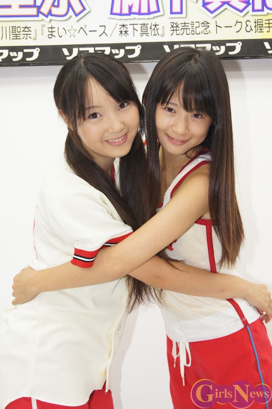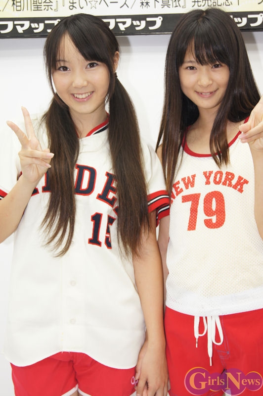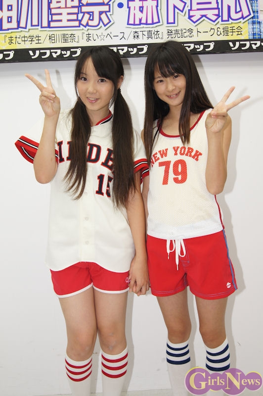 今回の作品について相川聖奈さんは「今回は中学生だよってところを見てもらうために、子供っぽいシーンがたくさん入ってます。衣装的にはピンクの金太郎みたいな衣装がおすすめです。」、森下真依さんは「クールな感じで撮影しました。体操着でサッカーで遊んだシーンがおすすめです。」と見どころをアピールしていた。