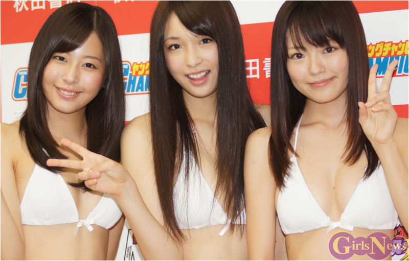 9月12日、「ミスヤングチャンピオン2011 グランプリ」の記者会見が都内で行われ、グランプリに選ばれた 堀川美加子(ほりかわ みかこ)・菅原梨央(すがわら りお)・松嶋ののか(まつしま ののか)の3人がフレッシュな純白ビキニ姿を披露した。