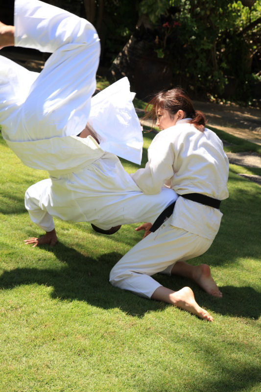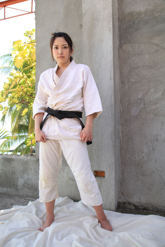 道花さんは柔道初段で黒帯を持つほどの腕前、実際にDVDの中でも180cm以上もある外国人を投げ飛ばしているシーンが収録されている。