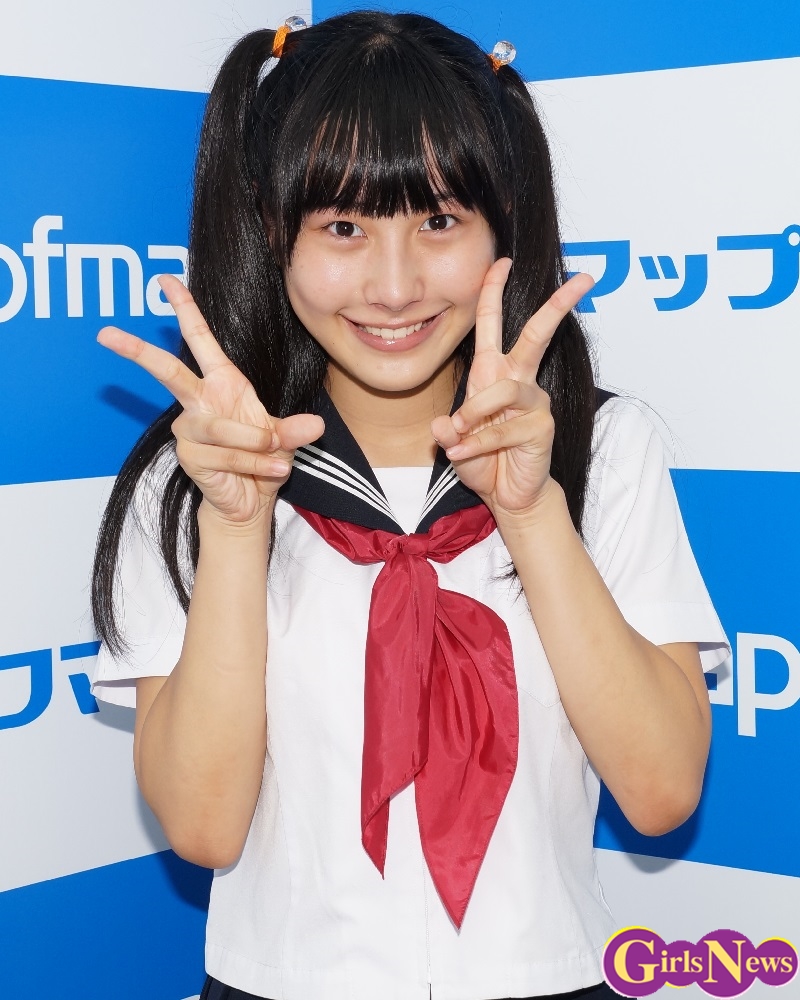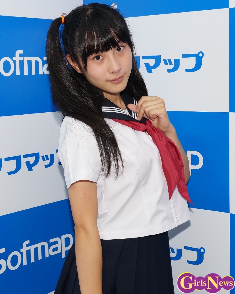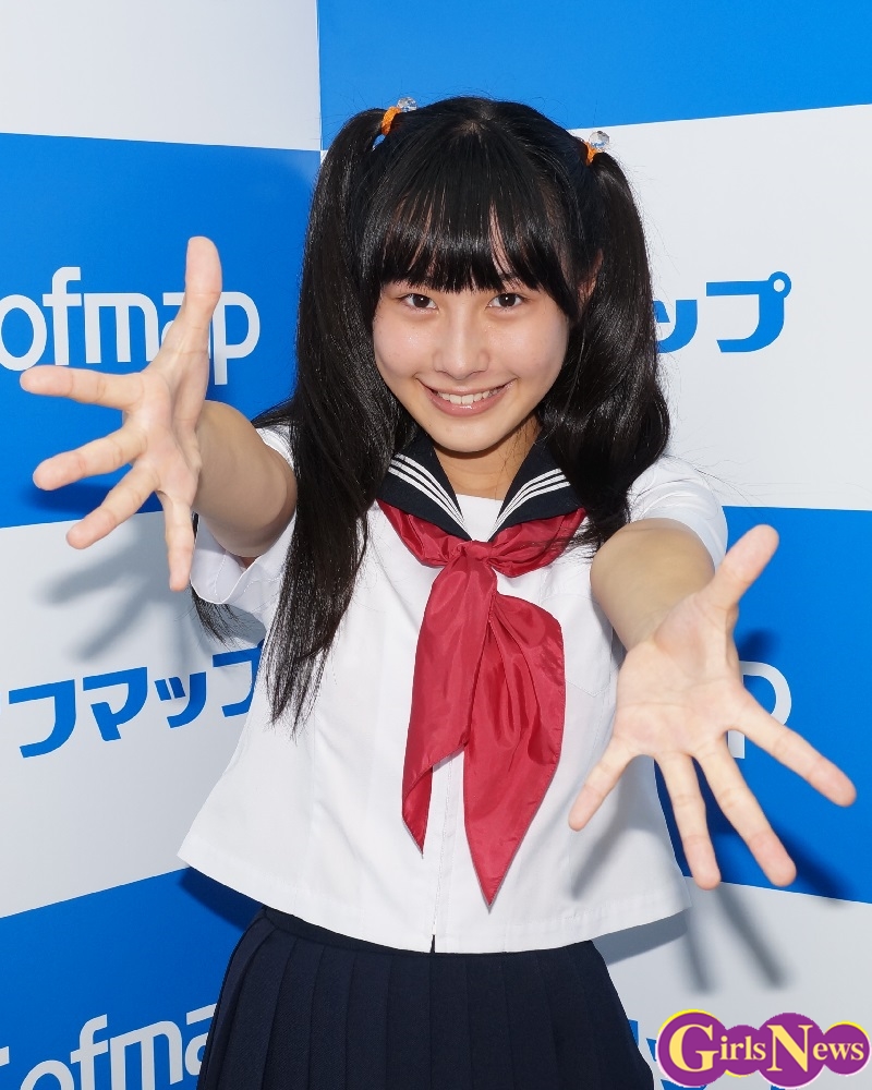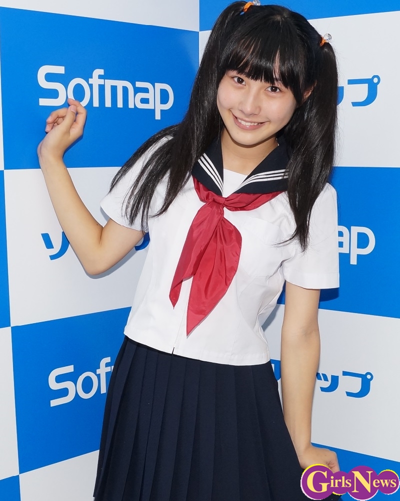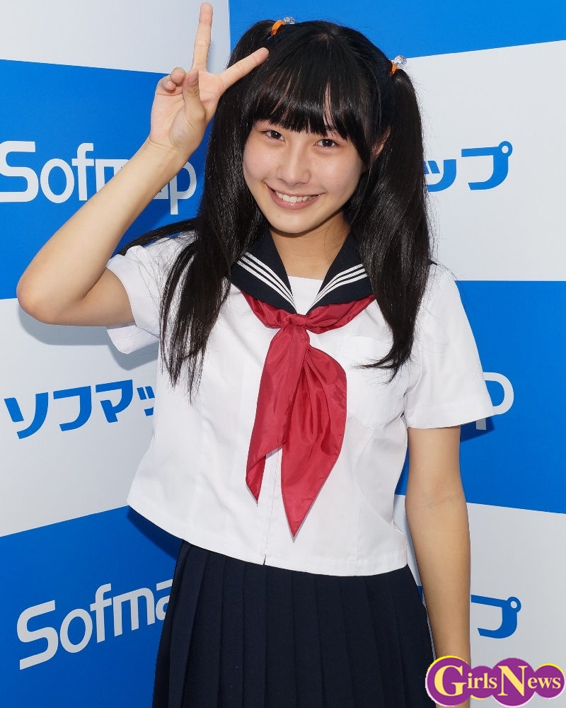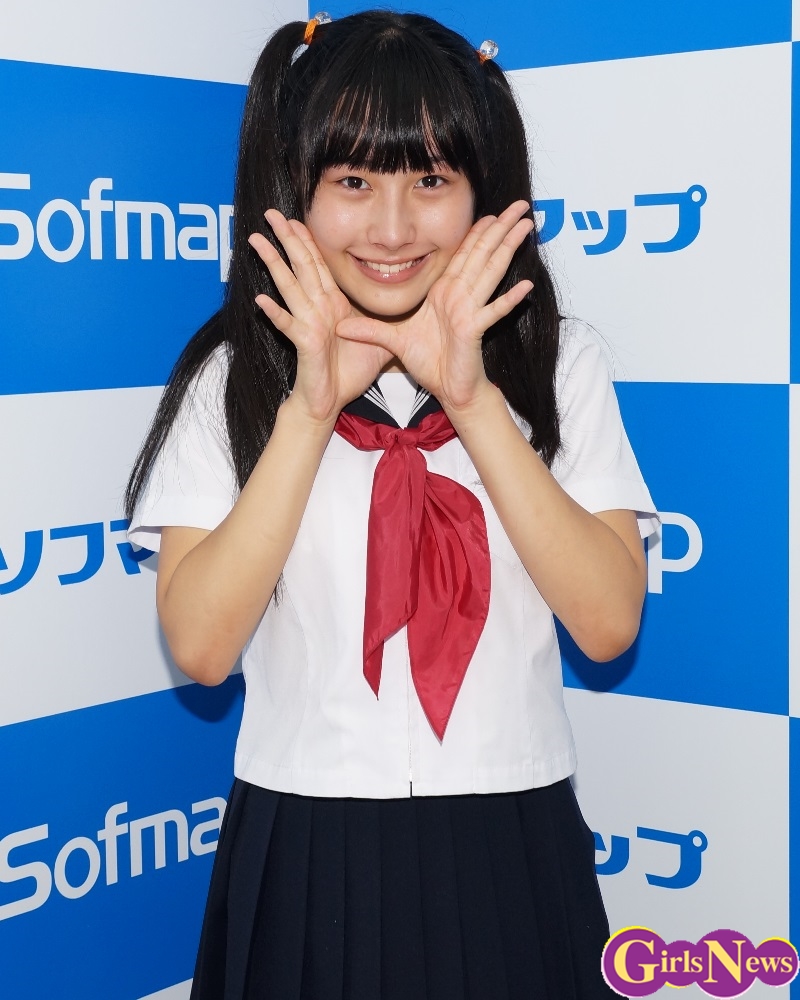 DVDの内容について質問されると「春休み中の撮影だったので、海のシーンは寒い中で頑張った姿を見ることができます。体操着や赤いスク水を着たり、今回は珍しい緑色のセーラー服を着ました。ジャケットになった青い水着のシーンは周りに白い建物が多く、光が反射してまぶしい中で撮影しました。」と紹介。