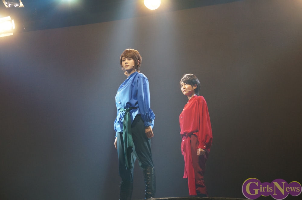 舞台にはダブルキャストで演じるものが多数存在するが、本公演では「リバースキャストシステム」を採用。嗣永桃子さんは「今回はリバースキャストシステムというものを取り入れているんですけど、これは劇中でに登場するライバルだったり親友だったり、生粋の立場になる人たちが、Berryz工房とスマイレージそれぞれ2人1組のペアになって交互に演じるというのがリバースキャストシステムです。」と紹介。