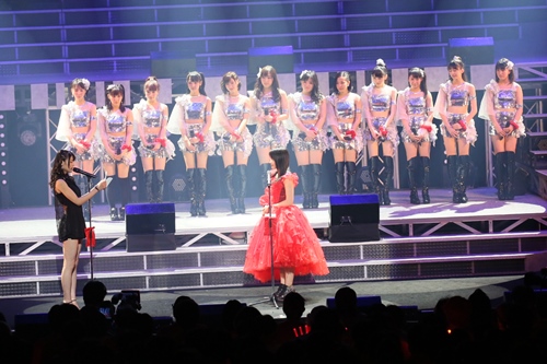 この日、パフォーマンス初のグループが2組。まずは、カントリー・ガールス、新人・梁川奈々美さん(13)、船木結さん(13)を加え、7人体制での良いバランスのグループに仕上がっていた。新人二人が加わり、初パフォーマンス楽曲は、カントリー・ガールズデビュー曲の『愛おしくってごめんね』を熱唱。初セリフは新人の梁川さんが担当した。