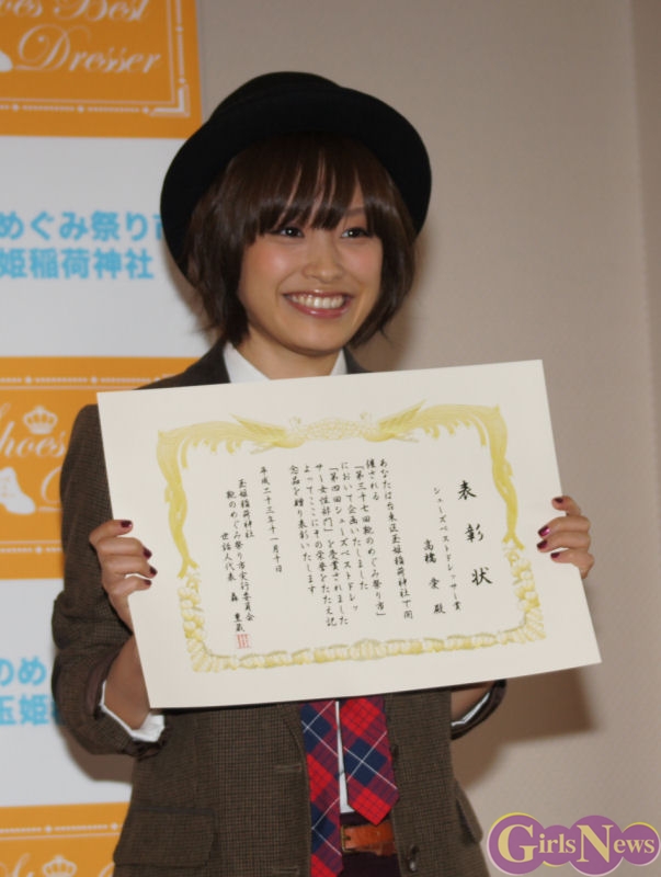 女性部門に選ばれた高橋愛さんは「モーニング娘。としてではなく、高橋愛として賞をいただけるのは初めてで、素直に喜びました。まさかこんな素敵な賞をいただけて、私の好きな靴を作ってくださってうれしいです。早速 靴棚の一番見えるところに飾りたいです。」と喜びのコメント。