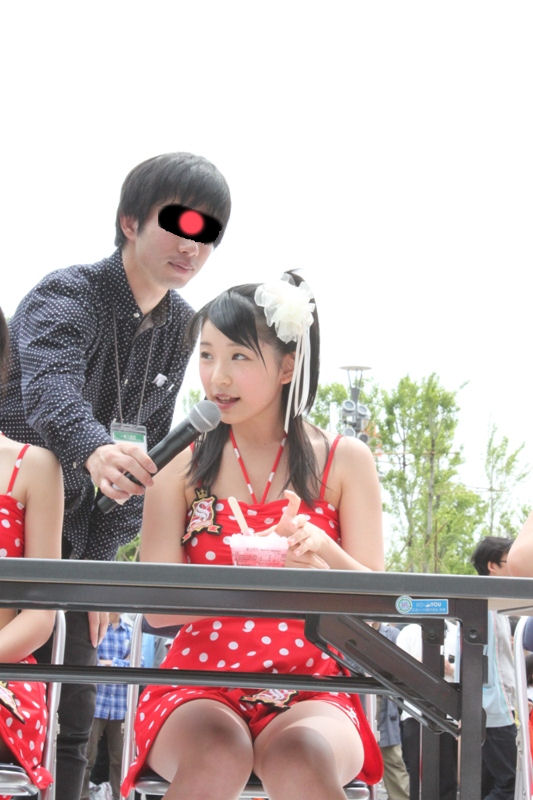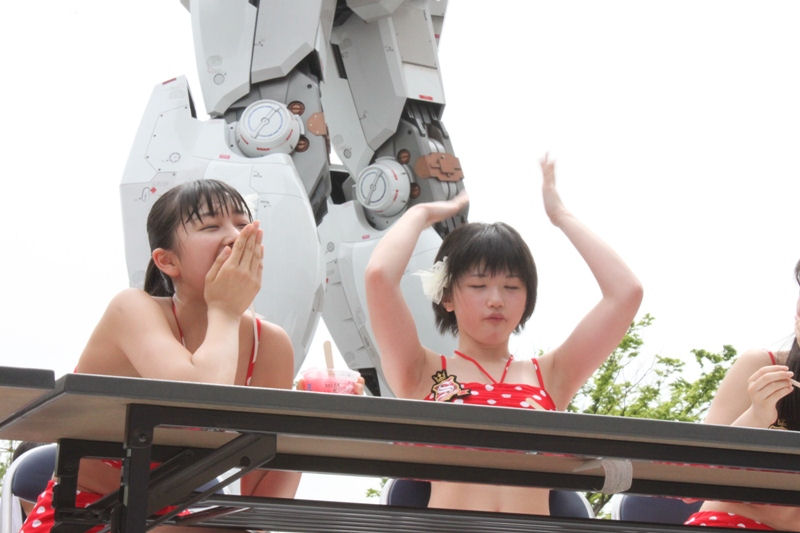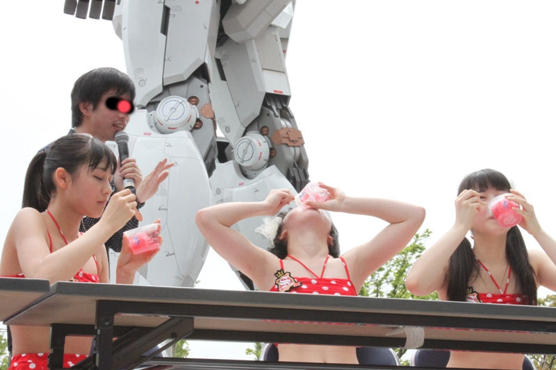 リーダーの和田彩花さんは「いつか後ろにあるガンダムよりビッグになれるようにガンバります!」と宣言し1回目のイベントが終了?いや、まだイベントは終わらない・・・・。今回のイベントは、ひと足早い夏をお届けがテーマということで、なんとサプライズで「スマイレージ かき氷早食い対決」が緊急開催! これはスマイレージのメンバーも聞かされておらず、しかも敗者にはとんでもない罰ゲームが・・・。