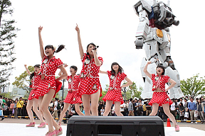 この日、集まった2000人のファンを前に、そして18メートルの等身大ガンダムをバックにしたステージで合計3回のミニライブ&握手会を開催。