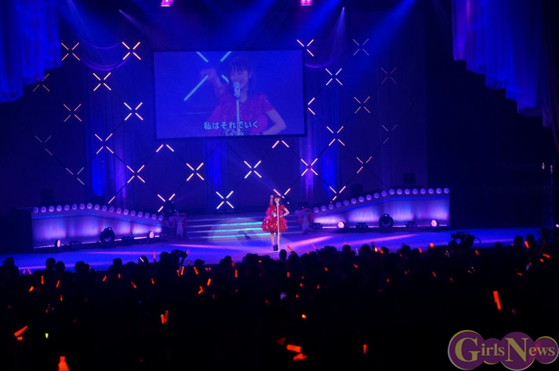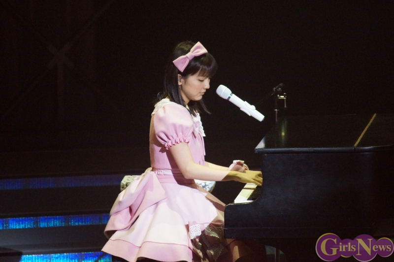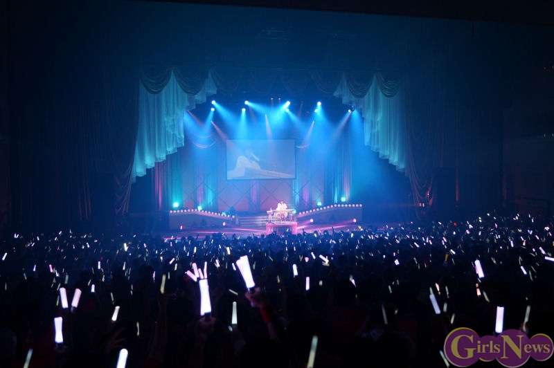 グランドピアノがステージ中央に置かれ、会場内一面が赤いサイリュームでいっぱいになる中、ピンク色の衣装に身を包んだ真野恵里菜さんが登場。