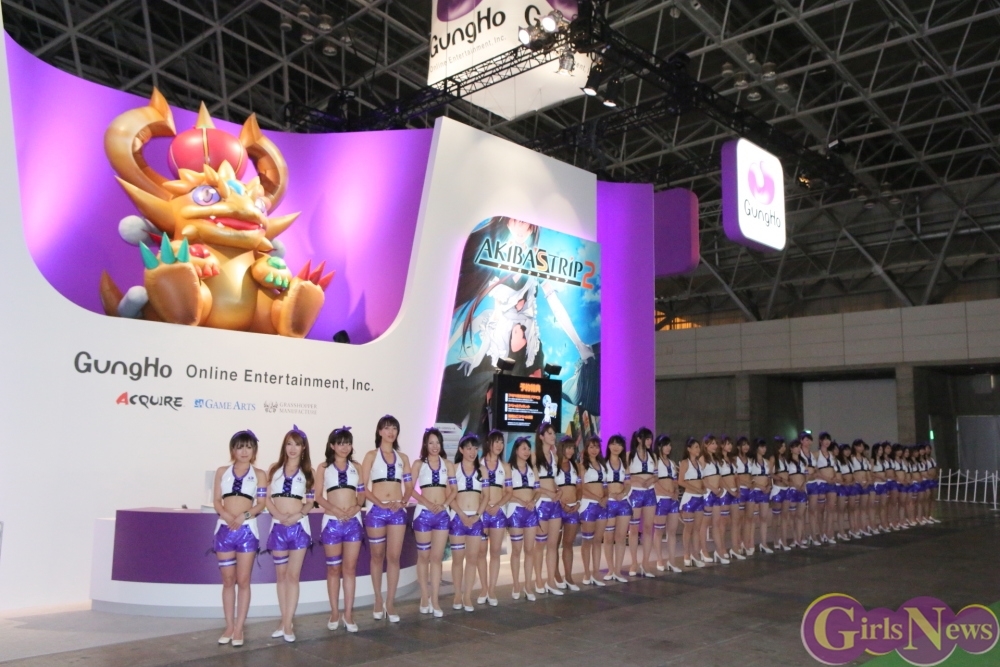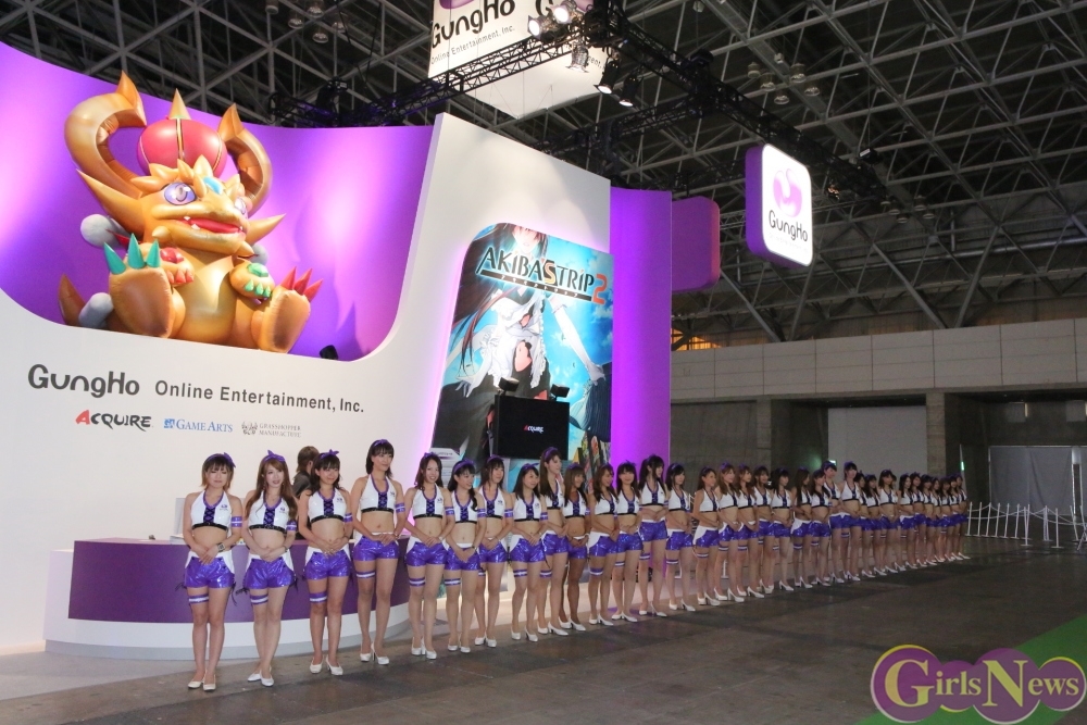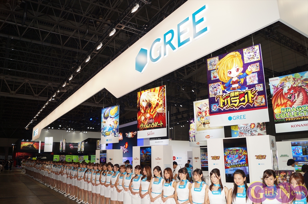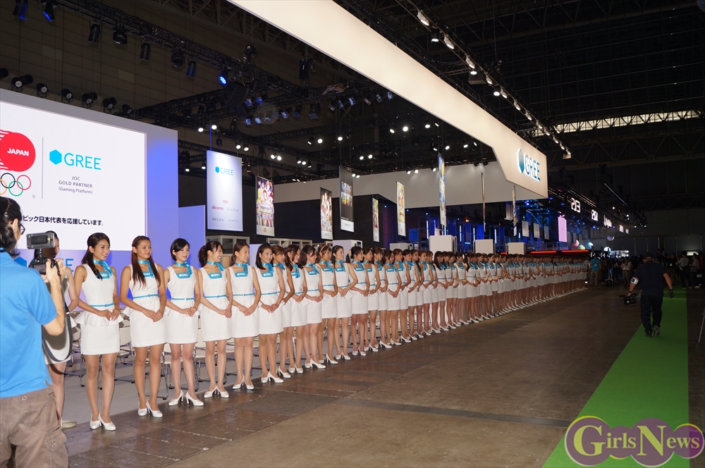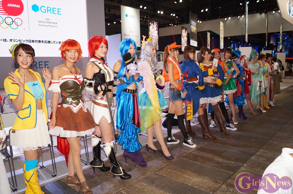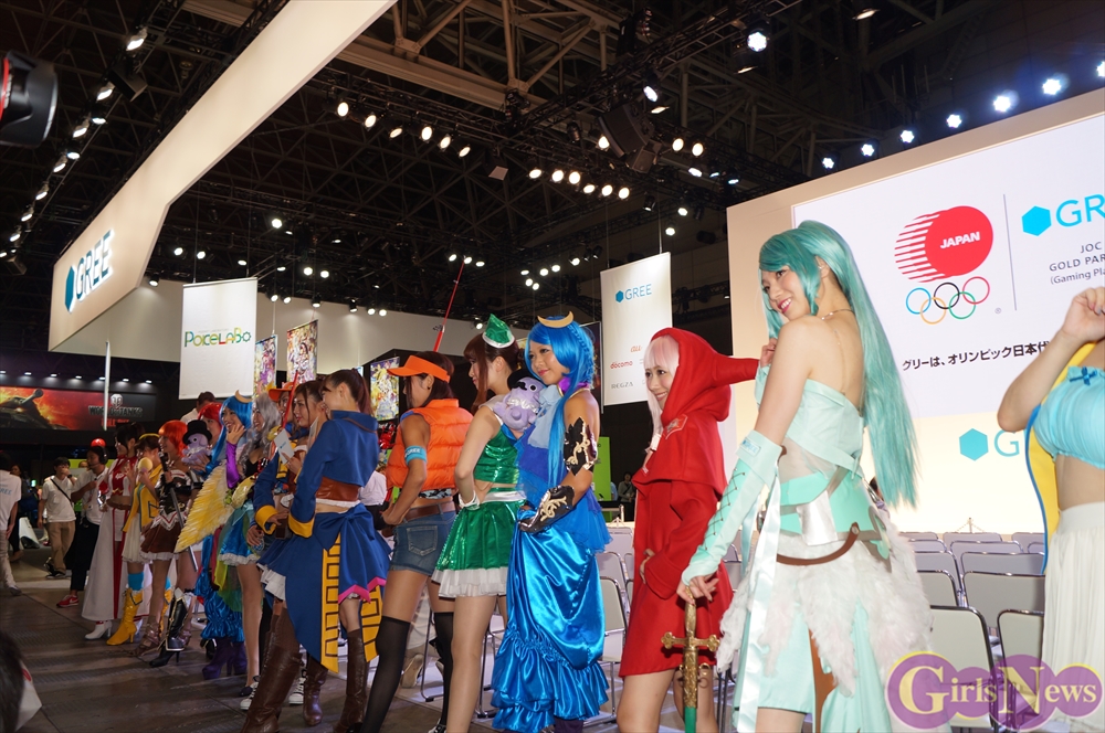 GREEのブースでは圧巻の美人コンパニオンのほか、それぞれゲームのキャラクターをイメージしたコスプレの人たちを見ることができる。各ステージのあとには、ステージから降り、ブース前で整列する場面も。