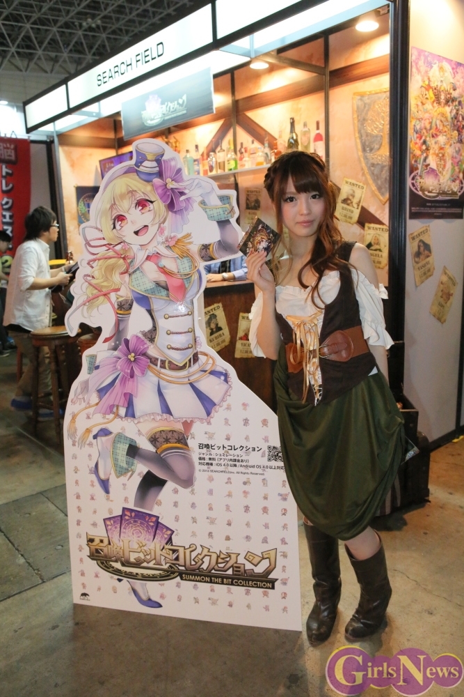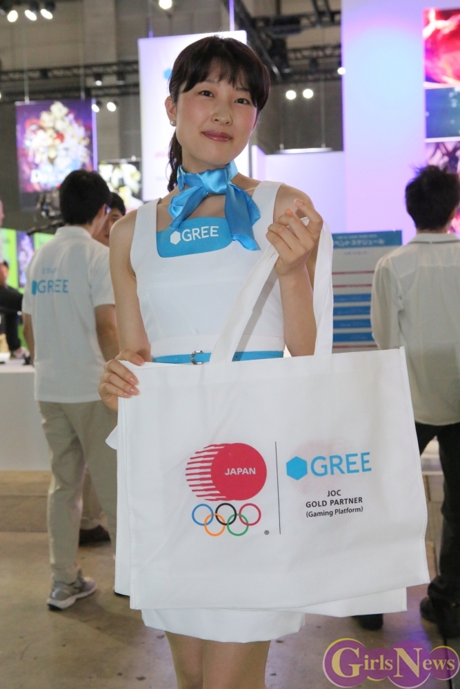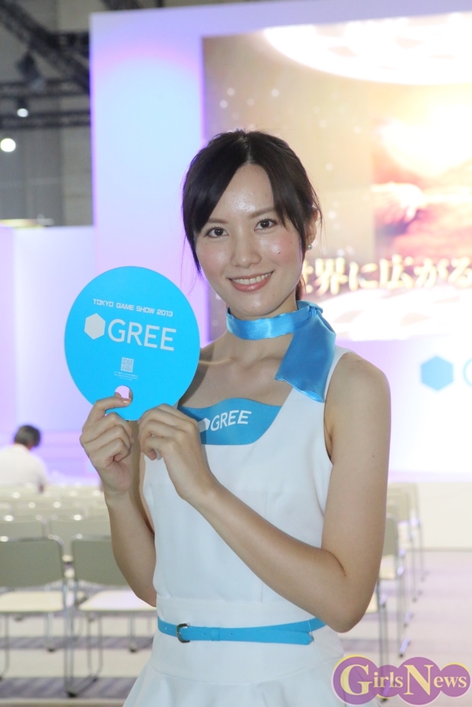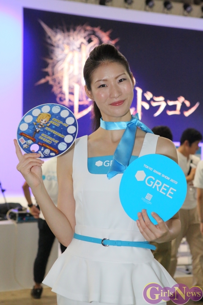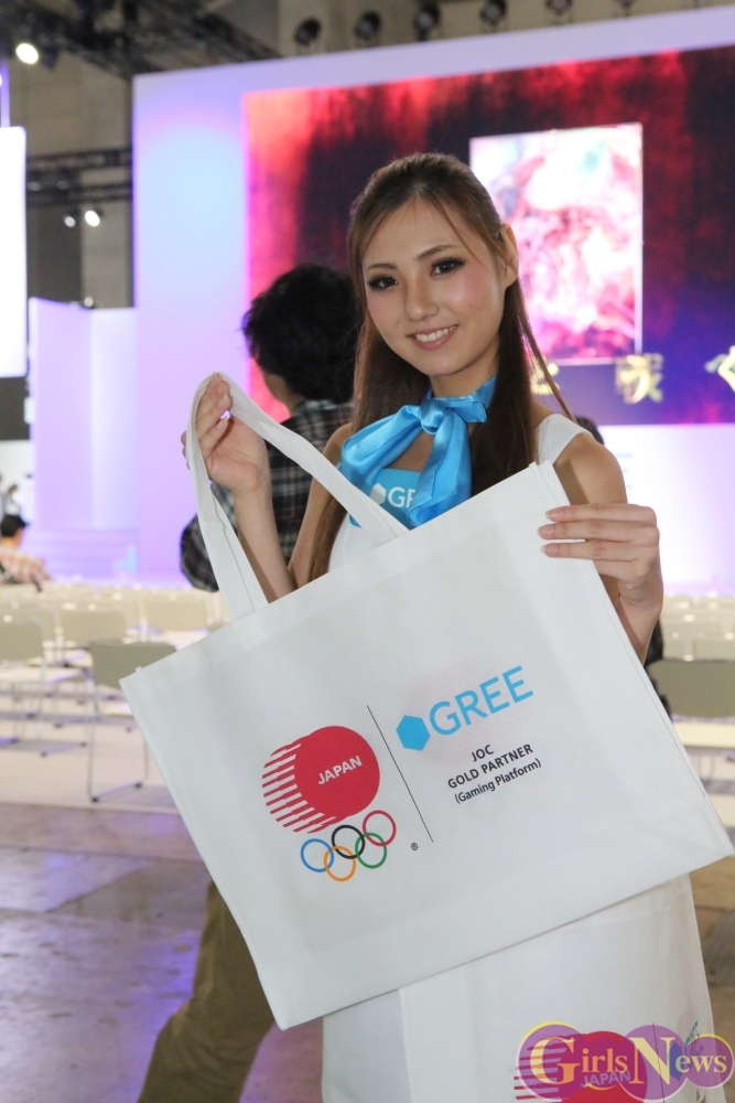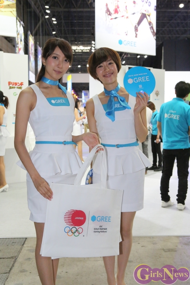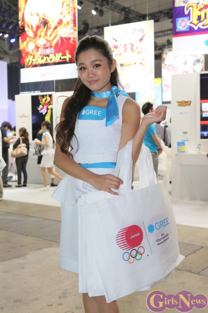 GREEのブースでは圧巻の美人コンパニオンのほか、それぞれゲームのキャラクターをイメージしたコスプレの人たちを見ることができる。各ステージのあとには、ステージから降り、ブース前で整列する場面も。