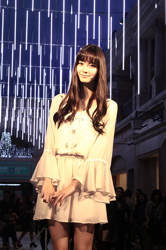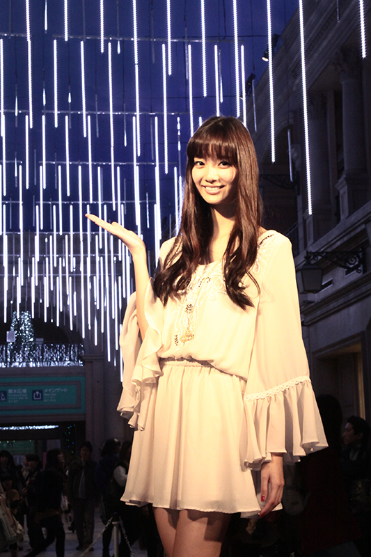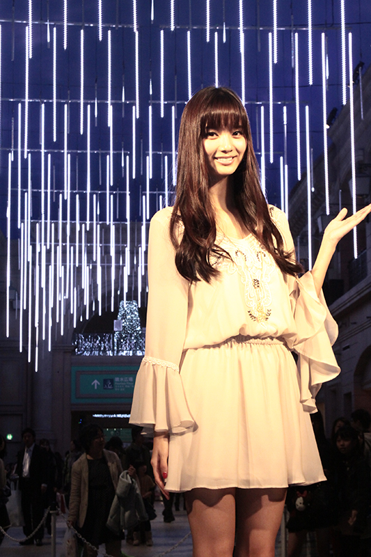 白のワンピースに赤のブーツでクリスマスをイメージした衣装で登場すると「顔が小さい! カワイイ!」と黄色い声援がとんだ。点灯式ではファンと一緒にカウントダウンでローマ神話をモチーフにしたイルミネーションが点灯。館内は幻想的な雰囲気につつまれた。