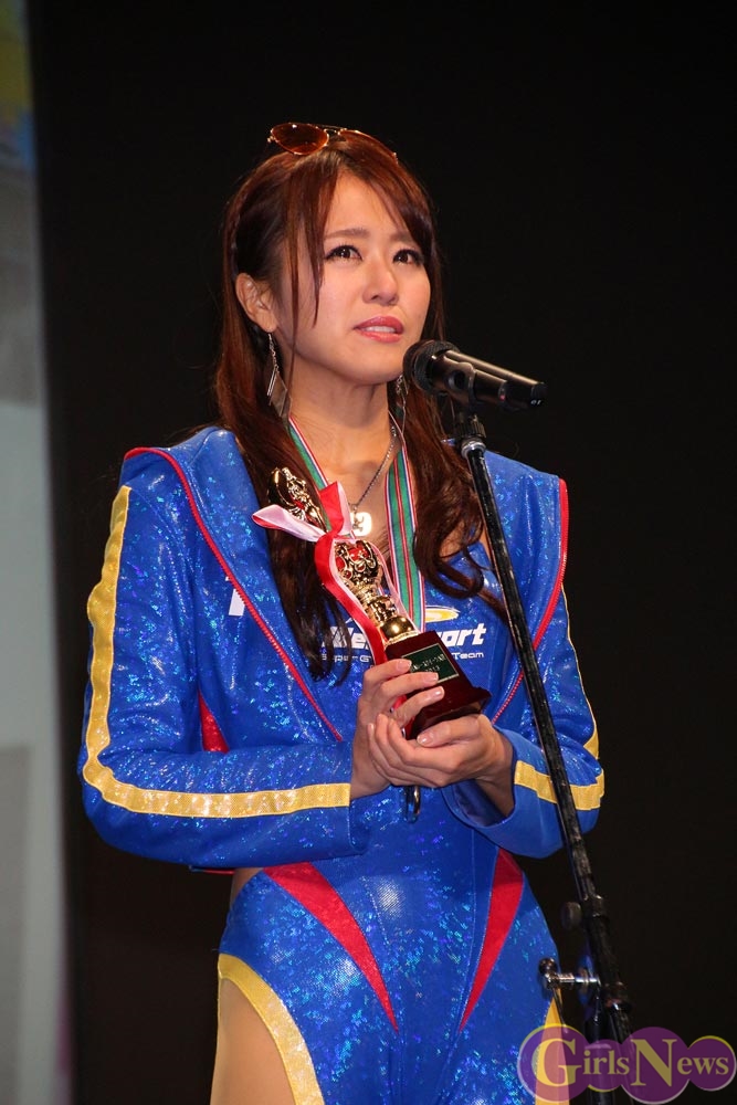 受賞した佐野真彩さんは、目を丸くして(信じられない…)という表情で顔を覆いながらステージの前に進み出て、「正直大賞だけでお腹いっぱいなくらい満足していたので、まさかグランプリで呼ばれるなんて思ってなくて、今は頭が真っ白です。今年は最高のチームメイトに出会えて、とても楽しくて充実した1年でした。ファンの皆さんが一緒に応援してくれて、この一年、いやもっと以前からの努力が実ったものだと思います。本当に皆さんに感謝の気持でいっぱいです。これからもレースクイーン大賞の名に恥じぬよう頑張っていきます。」と、次第に目に浮かんだ涙を頬に伝わせながら感謝の気持ちを伝えた。