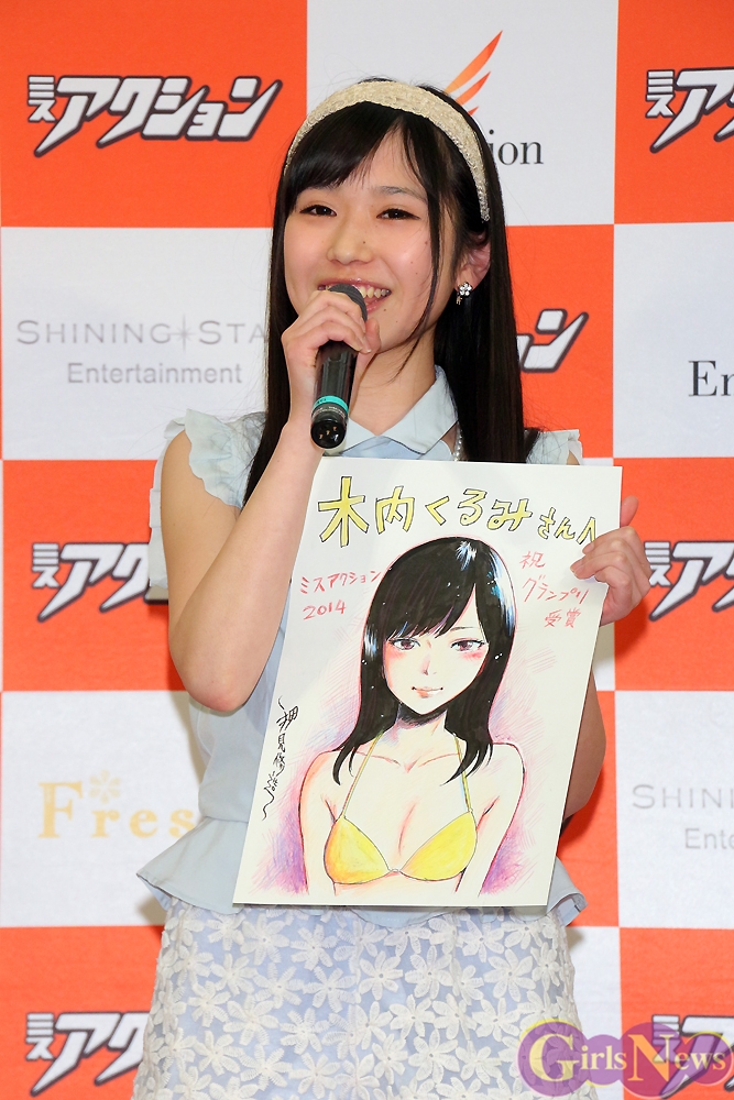 木内くるみさんは、「水着の仕事が初めてで水着を持ってなくて、選考が進むたびにお母さんからプレゼントしてもらったり、先輩から妹の友達まで借りまくって、いつの間にかここに立っていてました。本当に信じられない気持ちです。」と、戸惑いながらも嬉しさにはしゃいだ表情を見せていたが、「胸がなくて、水着のサイズが合わずに苦労しました。」とも明かした。