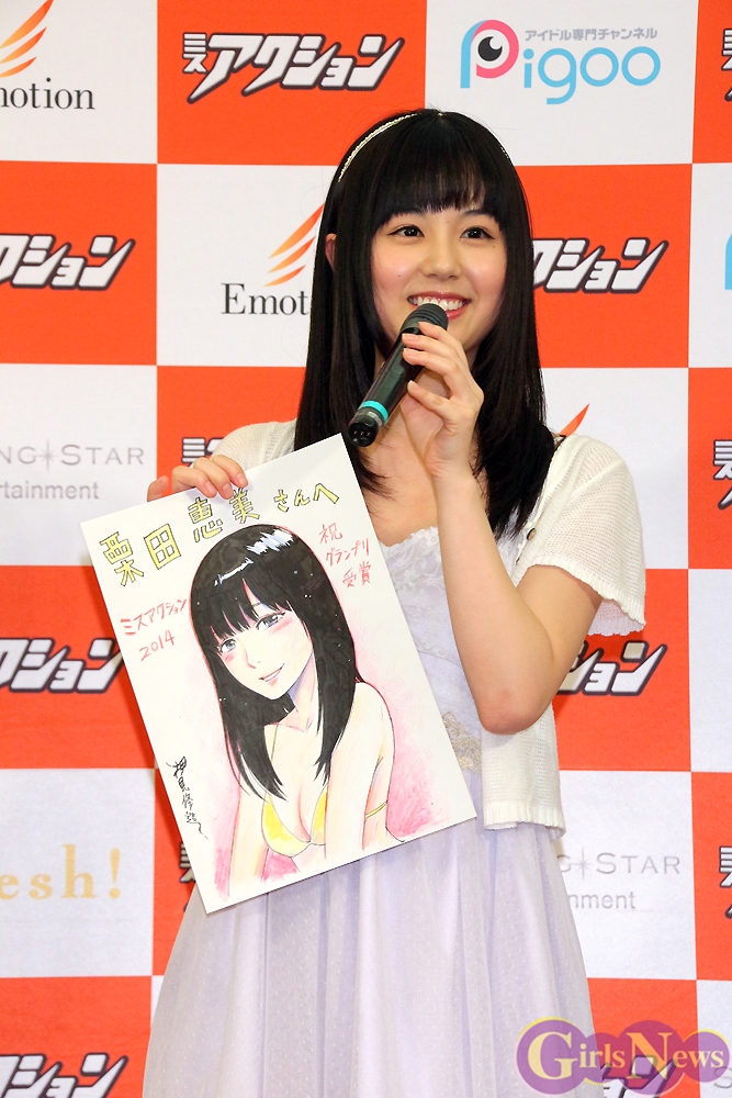 4月15日、双葉社「漫画アクション」主催ミスアクション2014グランプリの発表記者会見が都内で行われ、受賞した木内くるみ、栗田恵美、水月桃子が出席した。