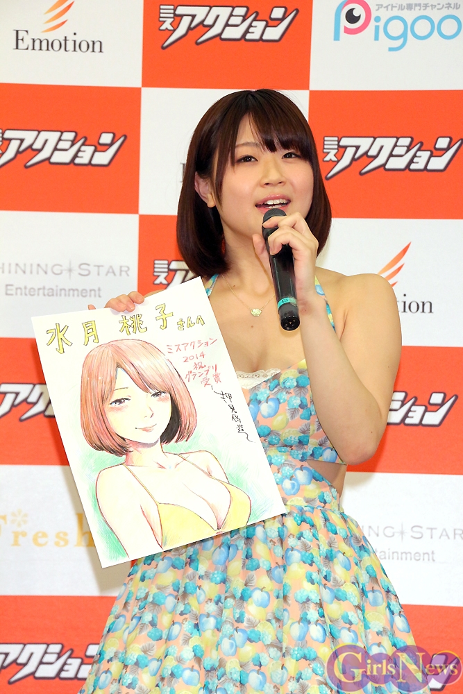 普段からアニメや漫画が大好きな水月桃子さんは、漫画アクションで活躍中の押見修造先生の描いた似顔絵を受け取って「玄関に飾ります!」と大喜び。自慢のHカップを強調するような衣装で、「くるみちゃんは女の子は胸だけじゃないって言ってましたけど、私は胸です!」と宣言。今回のコンテストを、「ヤル気は100%あったけど自信はなくて、ファンの方に応援をお願いすることが負担になるんじゃないかって心配だった。それなのにこんなに応援してくれて、私をグランプリにしていただいて、本当に嬉しいでございます。」