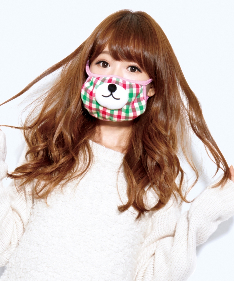 コーディネートのアクセントとなる、チェック柄にかわいいくまのハナがついたマスク。